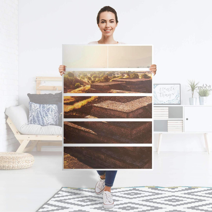 Unsere Möbel Klebefolie Teotihuacan für die Malm Kommode 6 Schubladen (hoch) ist der Blickfang in jedem Schlafzimmer. Die Dekofolien sind hochwertige, selbsthaftende Vinylfolien (seidenmatt) und können dank Bubble-free Technologie kinderleicht verklebt werden.