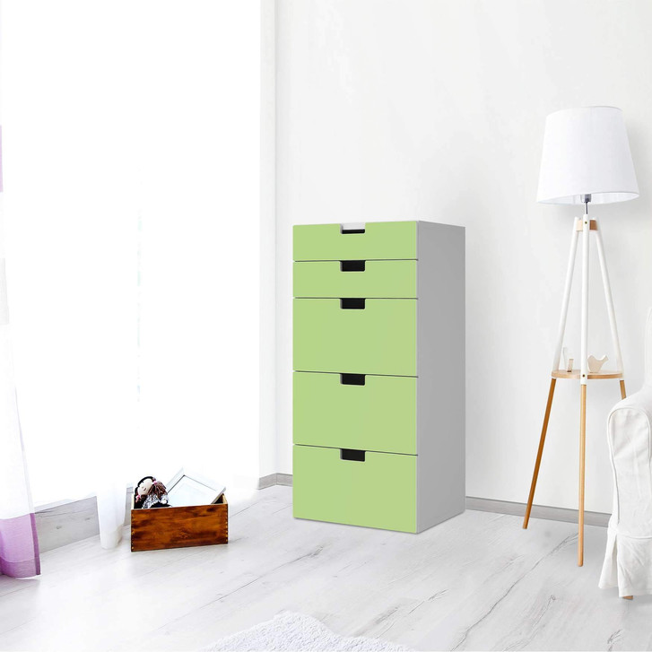 Unsere Möbel Klebefolie Hellgrün Light für die Stuva Kommode - 5 Schubladen ist der Blickfang im Wohnzimmer. Unsere Dekofolien sind hochwertige, selbsthaftende Vinylfolien (seidenmatt) und können dank Bubble-free Technologie kinderleicht verklebt werden.