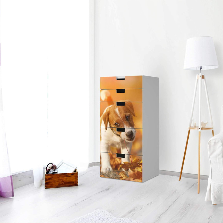 Unsere Möbel Klebefolie Jack the Puppy für die Stuva Kommode - 5 Schubladen ist der Blickfang im Wohnzimmer. Unsere Dekofolien sind hochwertige, selbsthaftende Vinylfolien (seidenmatt) und können dank Bubble-free Technologie kinderleicht verklebt werden.