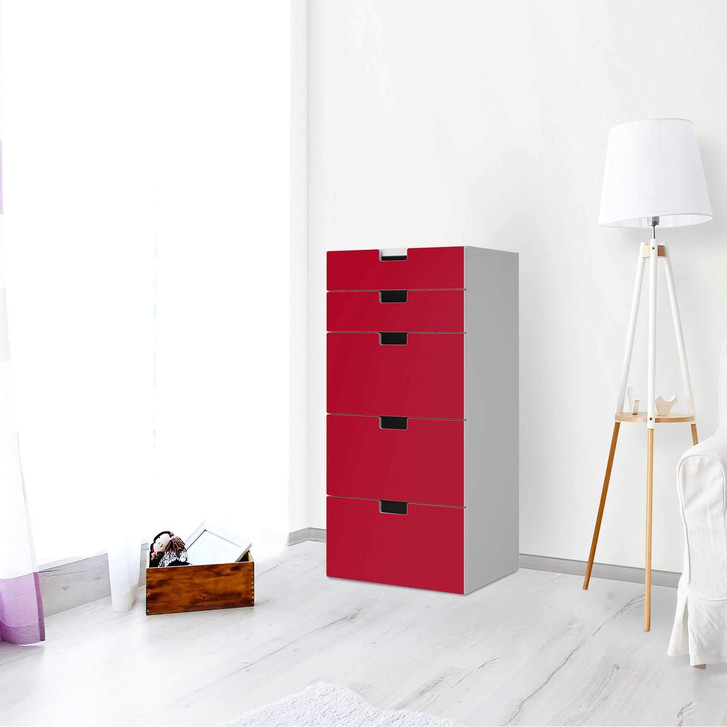 Unsere Möbel Klebefolie Rot Dark für die Stuva Kommode - 5 Schubladen ist der Blickfang im Wohnzimmer. Unsere Dekofolien sind hochwertige, selbsthaftende Vinylfolien (seidenmatt) und können dank Bubble-free Technologie kinderleicht verklebt werden.