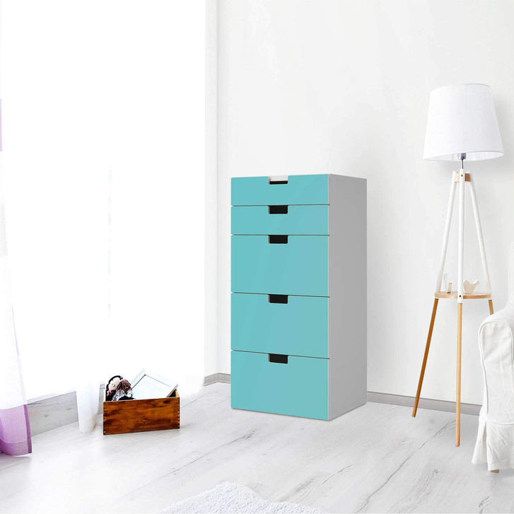 Unsere Möbel Klebefolie Türkisgrün Light für die Stuva Kommode - 5 Schubladen ist der Blickfang im Wohnzimmer. Unsere Dekofolien sind hochwertige, selbsthaftende Vinylfolien (seidenmatt) und können dank Bubble-free Technologie kinderleicht verklebt werden.