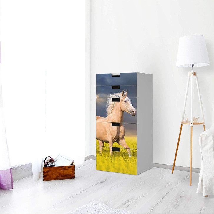 Unsere Möbel Klebefolie Wildpferd für die Stuva Kommode - 5 Schubladen ist der Blickfang im Wohnzimmer. Unsere Dekofolien sind hochwertige, selbsthaftende Vinylfolien (seidenmatt) und können dank Bubble-free Technologie kinderleicht verklebt werden.