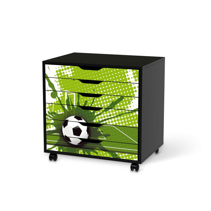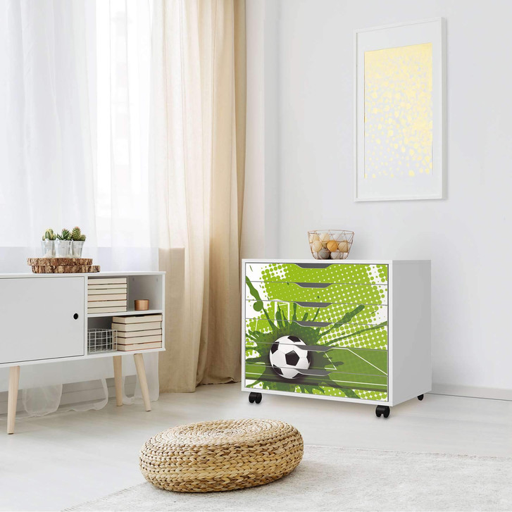 Unsere Möbelfolie Goal für den Alex Rollcontainer 6 Schubladen ist der Blickfang im Kinderzimmer. Unsere Dekofolien sind hochwertige, selbsthaftende Vinylfolien (seidenmatt) und können dank Bubble-free Technologie kinderleicht verklebt werden.