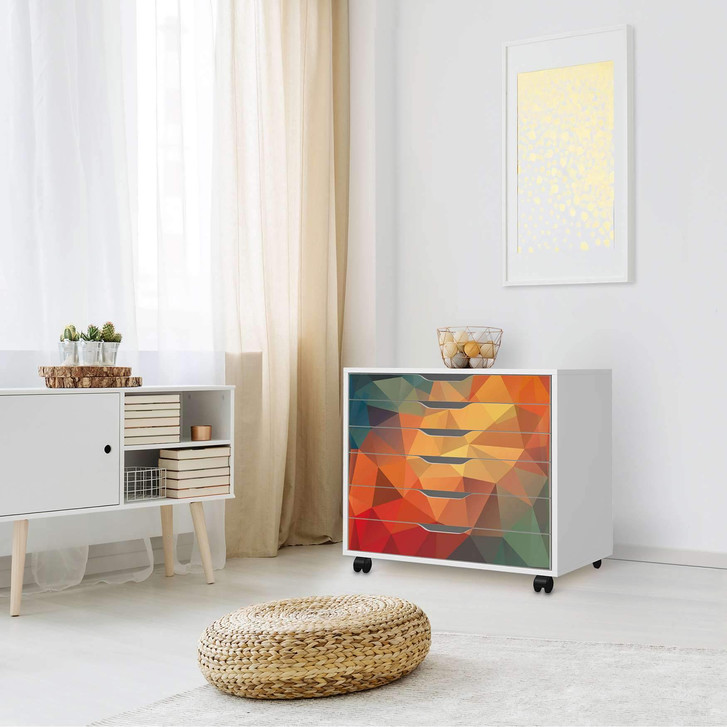 Unsere Möbelfolie Polygon für den Alex Rollcontainer 6 Schubladen ist der Blickfang im Wohnzimmer. Unsere Dekofolien sind hochwertige, selbsthaftende Vinylfolien (seidenmatt) und können dank Bubble-free Technologie kinderleicht verklebt werden.