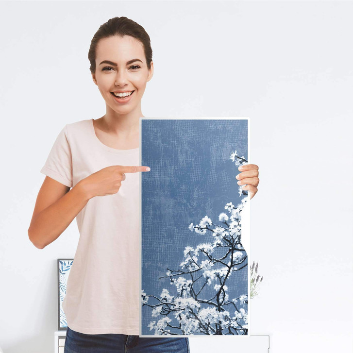 Das Trägerpapier von der Folie ca. 10-20 cm abziehen und am oberen Bereich des Objektes positionieren. Zieh jetzt das Trägerpapier Stück für Stück von der Motivfolie nach unten hin ab und streiche das Motiv vorsichtig an der Möbeloberfläche fest.