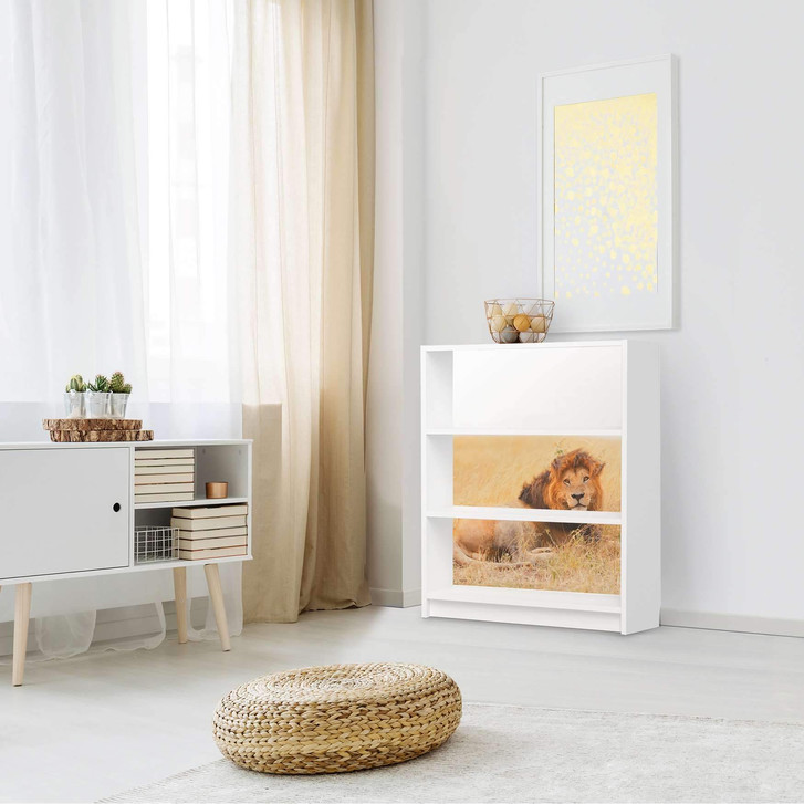 Unsere Möbelfolie Lion King für das Billy Regal 3 Fächer ist der Blickfang in jedem Wohnzimmer. Die Dekofolien sind hochwertige, selbsthaftende Vinylfolien (seidenmatt) und können dank Bubble-free Technologie kinderleicht verklebt werden.