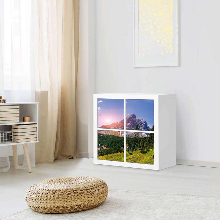 Unsere Möbelfolie Alpenblick für das Expedit Regal 4 Türen ist der Blickfang in jedem Wohnzimmer. Die Dekofolien sind hochwertige, selbsthaftende Vinylfolien (seidenmatt) und können dank Bubble-free Technologie kinderleicht verklebt werden.