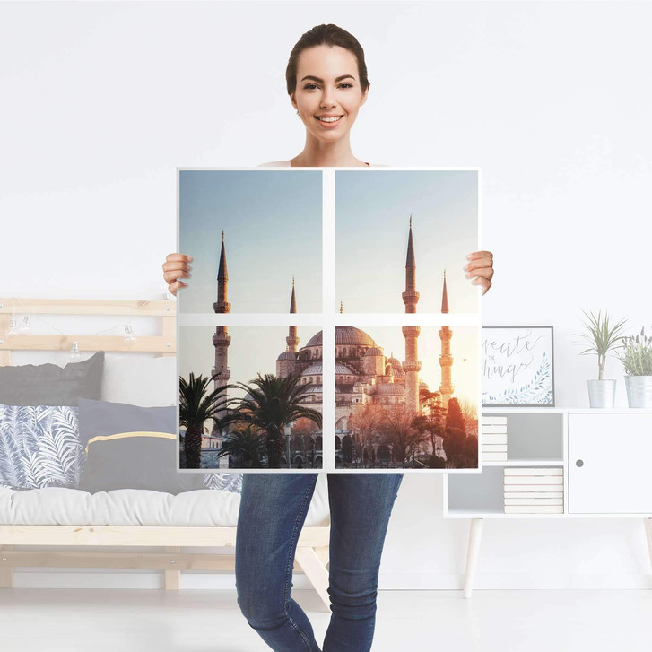 Unsere Möbelfolie Blue Mosque für das Expedit Regal 4 Türen ist der Blickfang in jedem Wohnzimmer. Die Dekofolien sind hochwertige, selbsthaftende Vinylfolien (seidenmatt) und können dank Bubble-free Technologie kinderleicht verklebt werden.