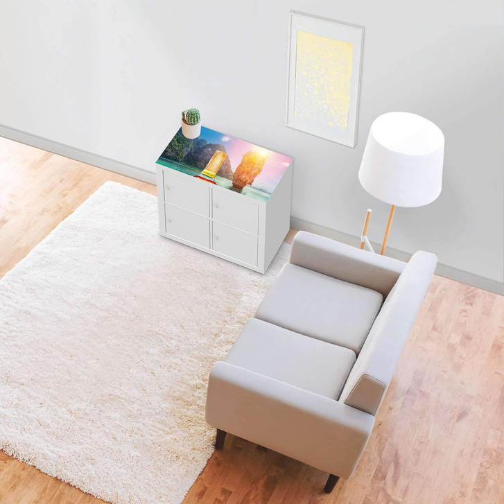 Unsere Möbelfolie Blue Water Lagoon für das Expedit Regal oben ist der Blickfang in jedem Wohnzimmer. Die Dekofolien sind hochwertige, selbsthaftende Vinylfolien (seidenmatt) und können dank Bubble-free Technologie kinderleicht verklebt werden.