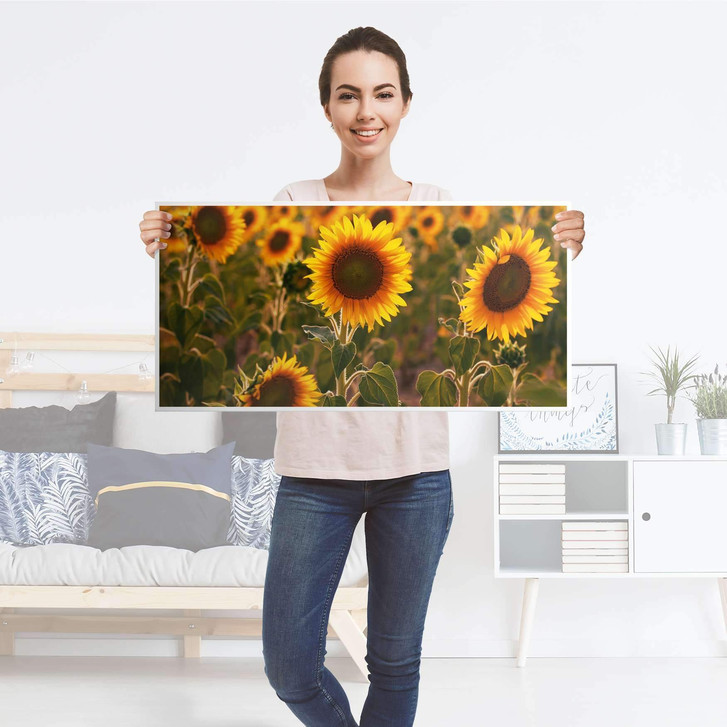 Unsere Möbelfolie Sunflowers für das Expedit Regal oben ist der Blickfang in jedem Wohnzimmer. Die Dekofolien sind hochwertige, selbsthaftende Vinylfolien (seidenmatt) und können dank Bubble-free Technologie kinderleicht verklebt werden.