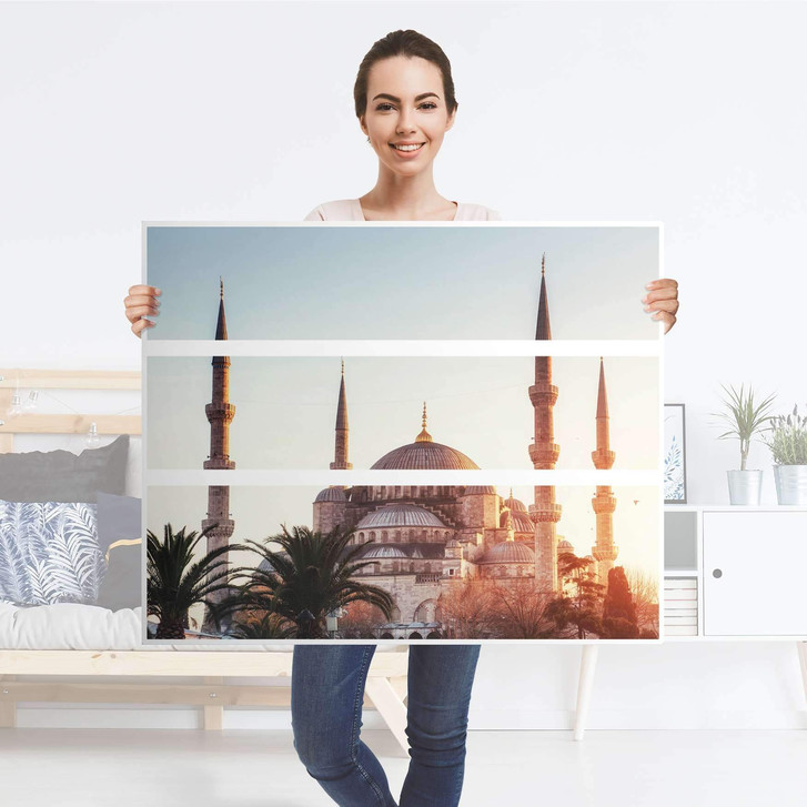 Unsere Möbelfolie Blue Mosque für die Hemnes Kommode 3 Schubladen ist der Blickfang in jedem Wohnzimmer. Die Dekofolien sind hochwertige, selbsthaftende Vinylfolien (seidenmatt) und können dank Bubble-free Technologie kinderleicht verklebt werden.