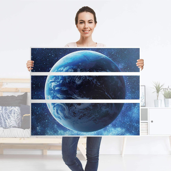 Unsere Möbelfolie Planet Blue für die Hemnes Kommode 3 Schubladen ist der Blickfang in jedem Wohnzimmer. Die Dekofolien sind hochwertige, selbsthaftende Vinylfolien (seidenmatt) und können dank Bubble-free Technologie kinderleicht verklebt werden.