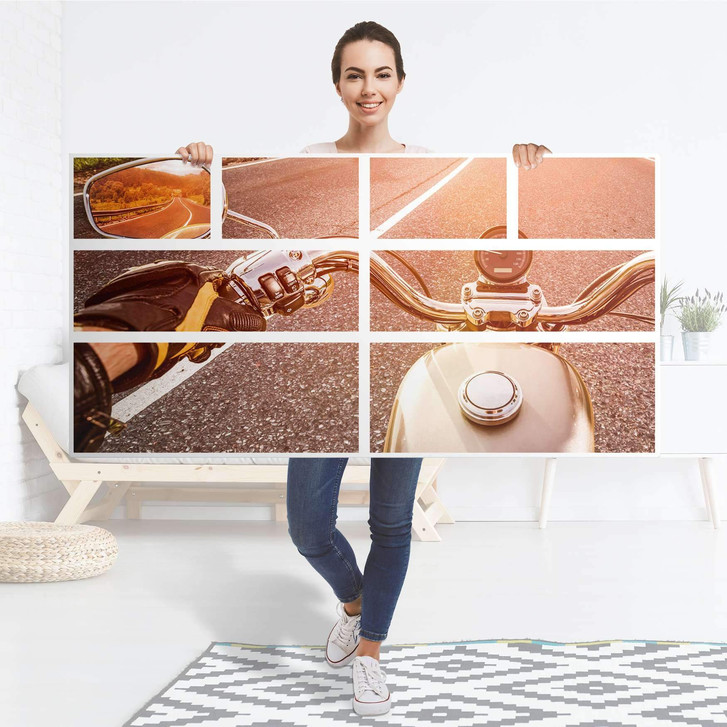 Unsere Möbelfolie Easy Rider für die Hemnes Kommode 8 Schubladen ist der Blickfang in jedem Wohnzimmer. Die Dekofolien sind hochwertige, selbsthaftende Vinylfolien (seidenmatt) und können dank Bubble-free Technologie kinderleicht verklebt werden.