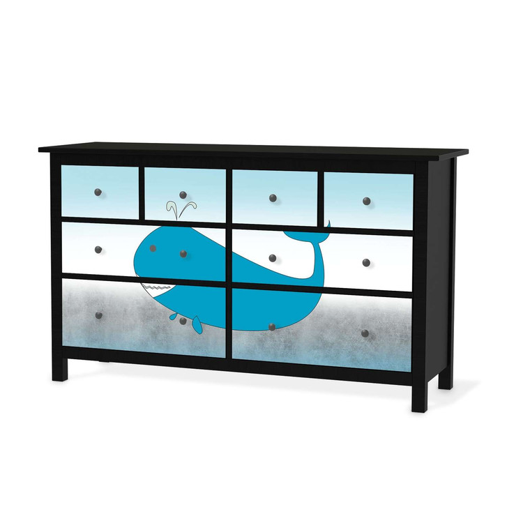 Unsere Möbelfolie Herr Wal für die Hemnes Kommode 8 Schubladen ist der Blickfang in jedem Kinderzimmer. Die Dekofolien sind hochwertige, selbsthaftende Vinylfolien (seidenmatt) und können dank Bubble-free Technologie kinderleicht verklebt werden.