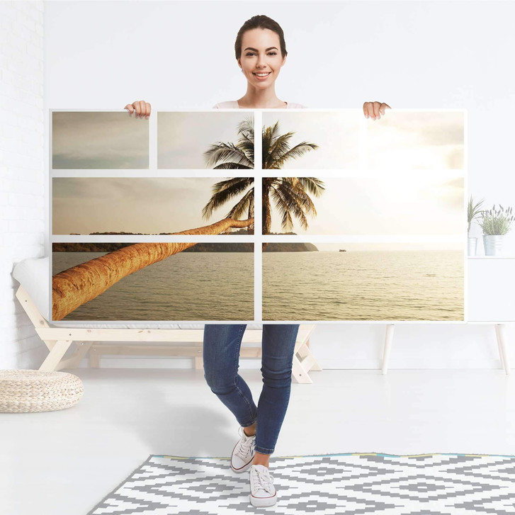 Unsere Möbelfolie Paradise für die Hemnes Kommode 8 Schubladen ist der Blickfang in jedem Wohnzimmer. Die Dekofolien sind hochwertige, selbsthaftende Vinylfolien (seidenmatt) und können dank Bubble-free Technologie kinderleicht verklebt werden.