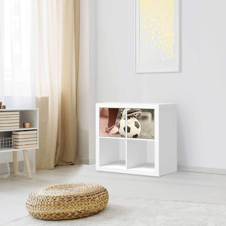 Unsere Möbelfolie Kick it für das Kallax Regal 2 Türen (quer) ist der Blickfang in jedem Kinderzimmer. Die Dekofolien sind hochwertige, selbsthaftende Vinylfolien (seidenmatt) und können dank Bubble-free Technologie kinderleicht verklebt werden.