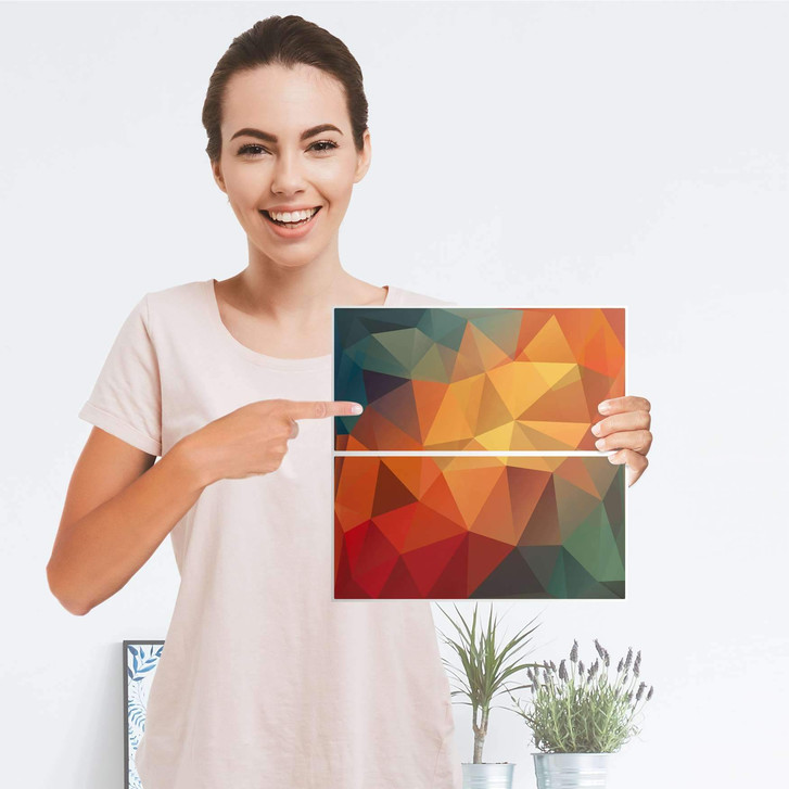 Unsere Möbelfolie Polygon für das Kallax Regal Schubladen ist der Blickfang in jedem Wohnzimmer. Die Dekofolien sind hochwertige, selbsthaftende Vinylfolien (seidenmatt) und können dank Bubble-free Technologie kinderleicht verklebt werden.