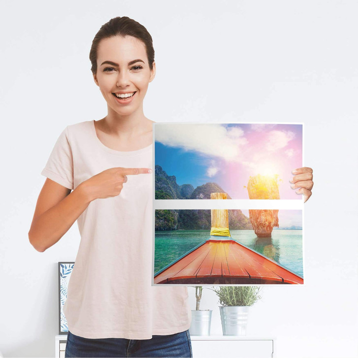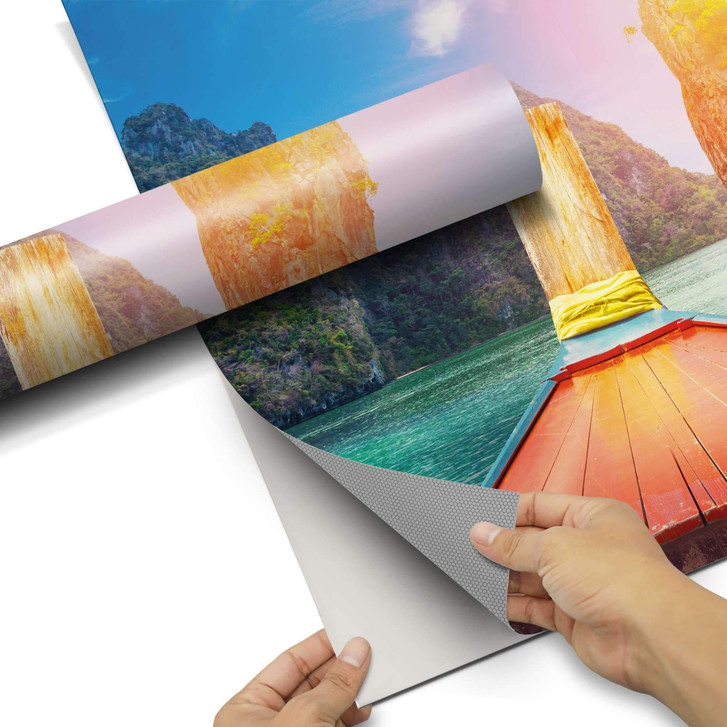 Das Trägerpapier von der Folie ca. 10-20 cm abziehen und am oberen Bereich des Objektes positionieren. Zieh jetzt das Trägerpapier Stück für Stück von der Motivfolie nach unten hin ab und streiche das Motiv vorsichtig an der Möbeloberfläche fest.
