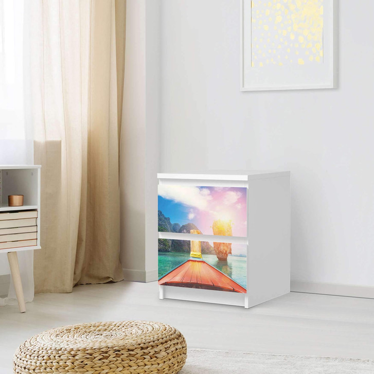 Unsere Möbelfolie Blue Water Lagoon für die Malm Kommode 2 Schubladen ist der Blickfang in jedem Schlafzimmer. Die Dekofolien sind hochwertige, selbsthaftende Vinylfolien (seidenmatt) und können dank Bubble-free Technologie kinderleicht verklebt werden.
