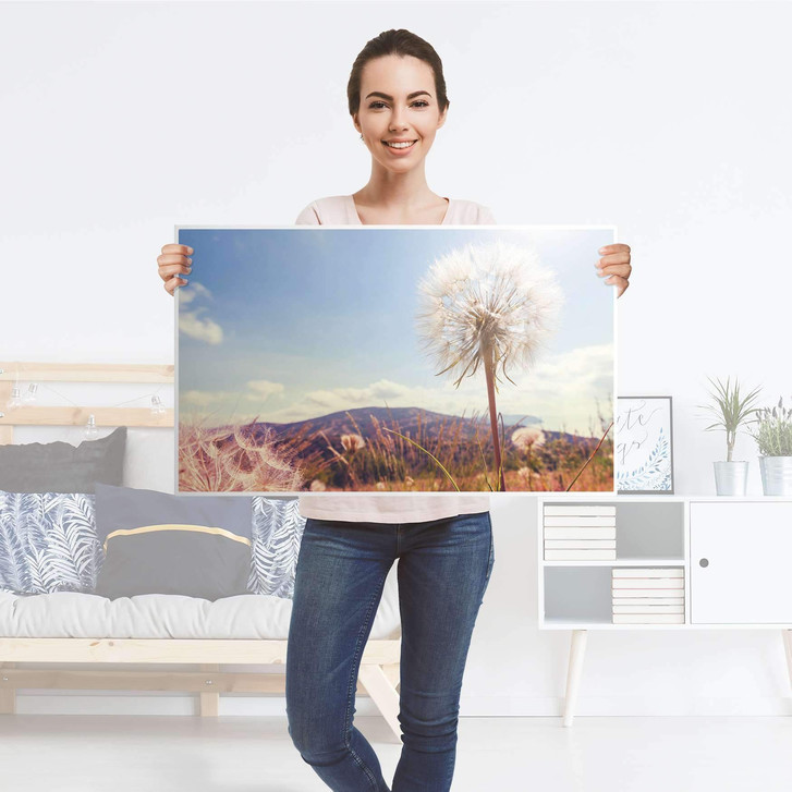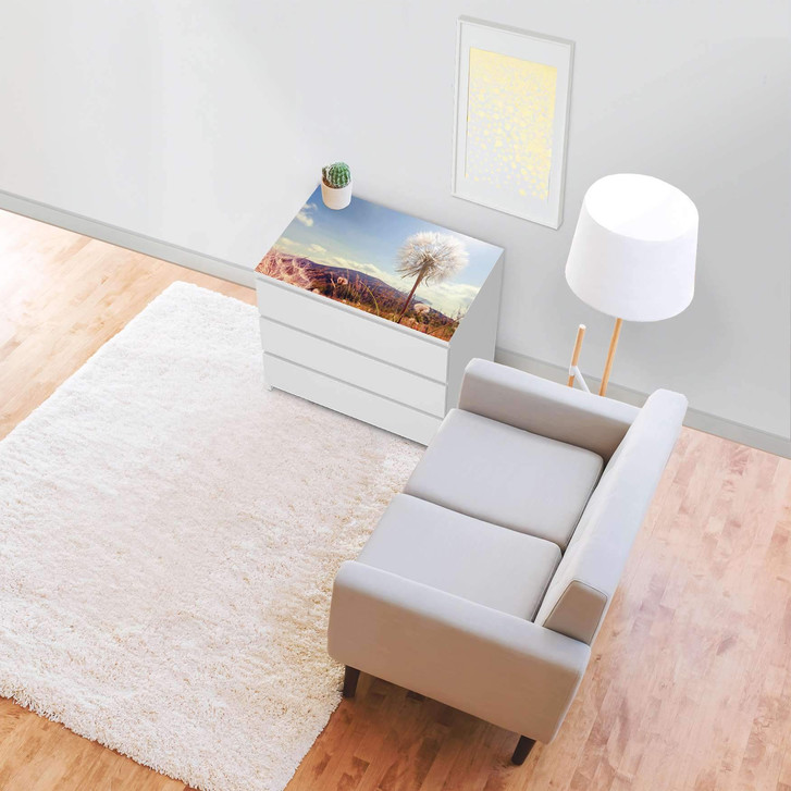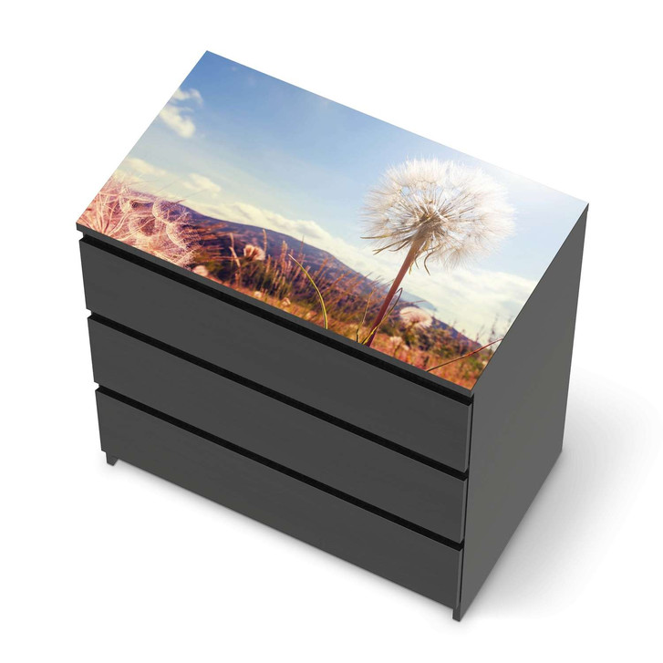 Unsere Möbelfolie Dandelion für die Malm Kommode 3 Schubladen oben ist der Blickfang in jedem Schlafzimmer. Die Dekofolien sind hochwertige, selbsthaftende Vinylfolien (seidenmatt) und können dank Bubble-free Technologie kinderleicht verklebt werden.
