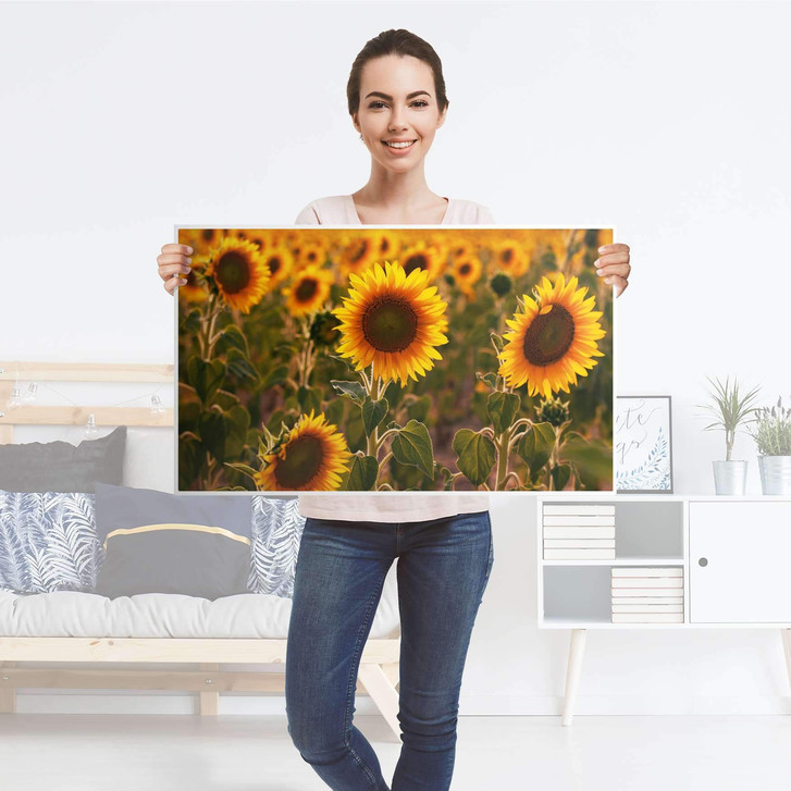 Unsere Möbelfolie Sunflowers für die Malm Kommode 3 Schubladen oben ist der Blickfang in jedem Schlafzimmer. Die Dekofolien sind hochwertige, selbsthaftende Vinylfolien (seidenmatt) und können dank Bubble-free Technologie kinderleicht verklebt werden.