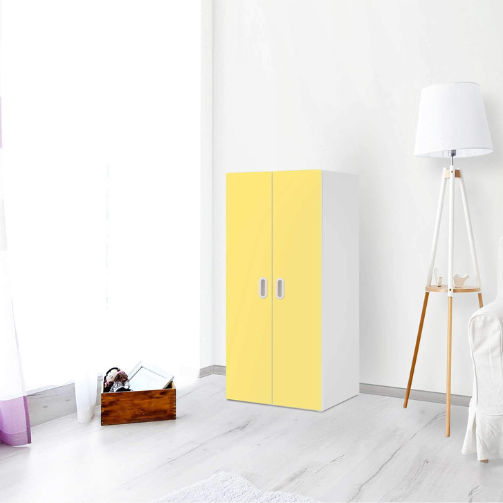 Unsere Möbelfolie Gelb Light für den Stuva / Fritids Schrank - 2 grosse Türen ist der Blickfang im Kinderzimmer. Unsere Dekofolien sind hochwertige, selbsthaftende Vinylfolien (seidenmatt) und können dank Bubble-free Technologie kinderleicht verklebt werden.