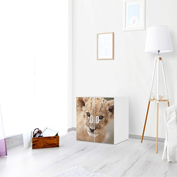Unsere Selbstklebende Folie Simba für den Stuva / Fritids Schrank - 2 kleine Türen ist der Blickfang im Kinderzimmer. Unsere Dekofolien sind hochwertige, selbsthaftende Vinylfolien (seidenmatt) und können dank Bubble-free Technologie kinderleicht verklebt werden.