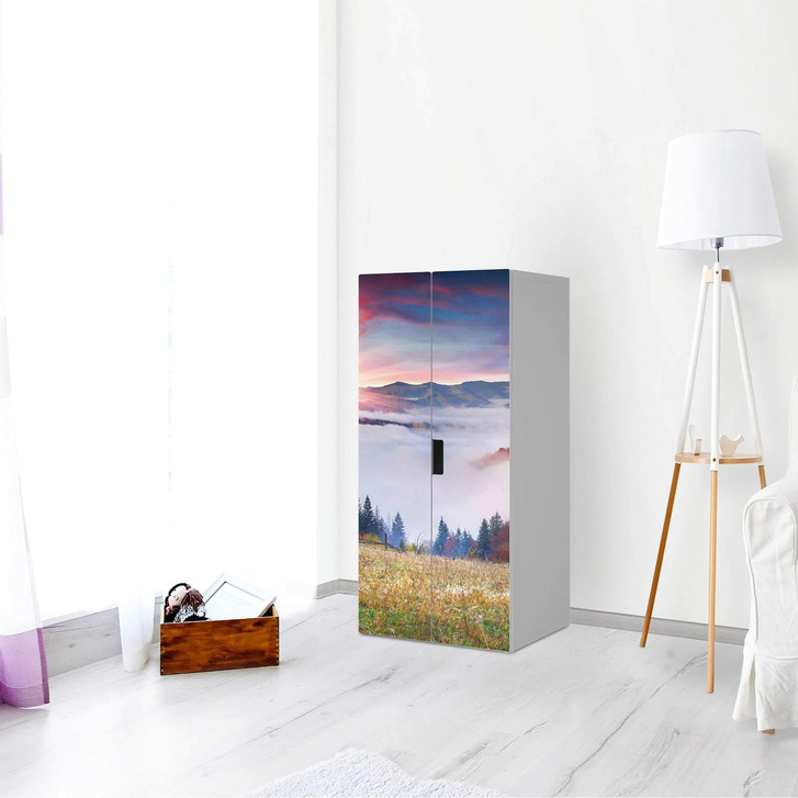 Unsere Möbelfolie Herbstwald für den Stuva Schrank - 2 grosse Türen ist der Blickfang im Wohnzimmer. Unsere Dekofolien sind hochwertige, selbsthaftende Vinylfolien (seidenmatt) und können dank Bubble-free Technologie kinderleicht verklebt werden.