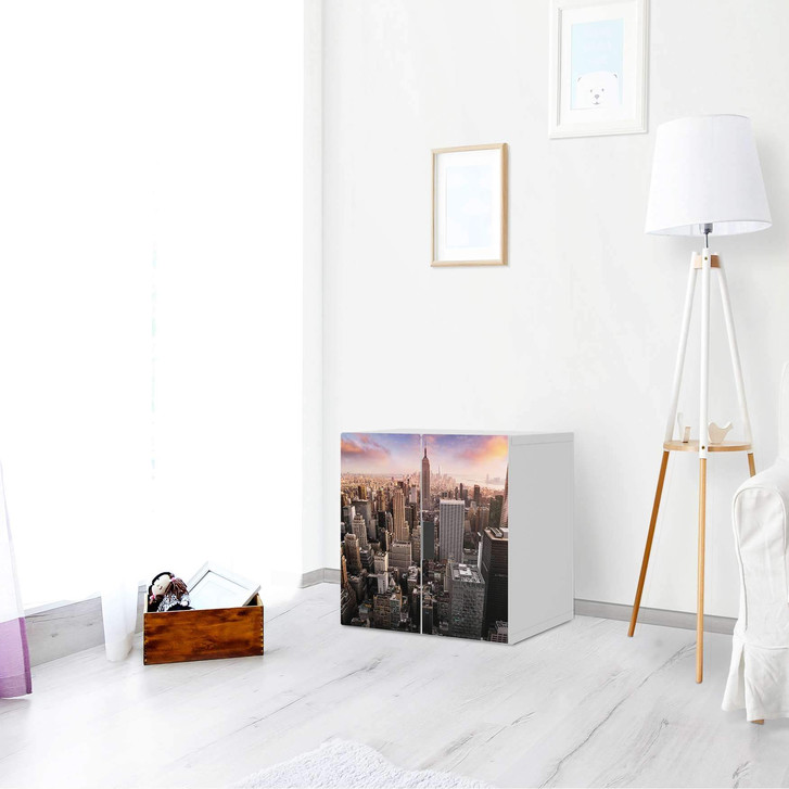 Unsere Selbstklebende Folie Big Apple für den Stuva Schrank - 2 kleine Türen ist der Blickfang im Wohnzimmer. Unsere Dekofolien sind hochwertige, selbsthaftende Vinylfolien (seidenmatt) und können dank Bubble-free Technologie kinderleicht verklebt werden.