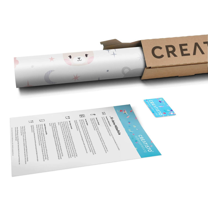 Das Trägerpapier von der Folie ca. 10-20 cm abziehen und am oberen Bereich des Objektes positionieren. Zieh jetzt das Trägerpapier Stück für Stück von der Motivfolie nach unten hin ab und streiche das Motiv vorsichtig an der Möbeloberfläche fest.