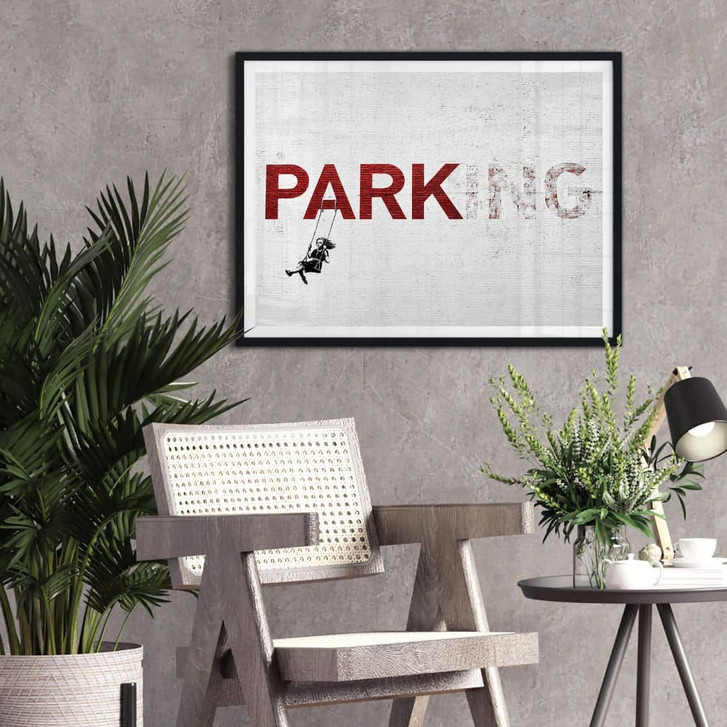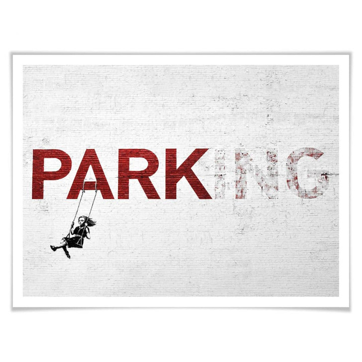 Bereichern Sie das eigene Zuhause mit originellen Bildern und schaffen Sie einen gemütlichen Ort um über die Welt nachzudenken. Dekorieren Sie Ihre leeren Wände mit den gesellschaftskritischen Graffitis des berühmten Strassen-Künstlers Banksy. Das Poster "Parking" befindet sich im Original seit 2010 an einem Parkhaus in Los Angeles, USA. hier nutzt Banksy einen bereits vorhanden Schriftzug. Der "ing"-Teil des Schildes wurde weiss überstrichen, so dass der Parkplatz zum Park wird. Am Buchstaben A hängt ein schaukelndes Mädchen. Bansky kritisiert damit, dass es in LA an Orten mangelt, an denen Kinder sicher spielen können.