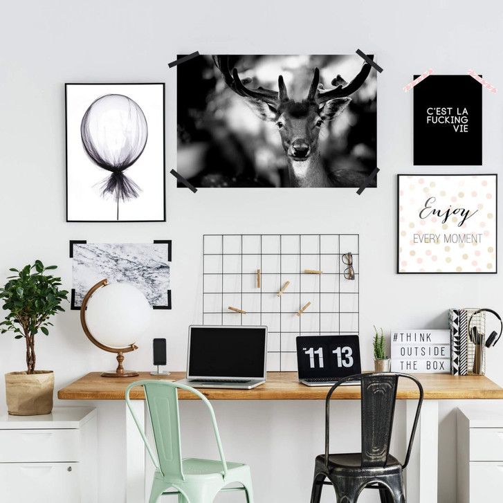 - Montagevorschläge: Tesa Tacks, Washi Tape, hochwertige Posterklemmen aus Metall oder Bilderrahmen
