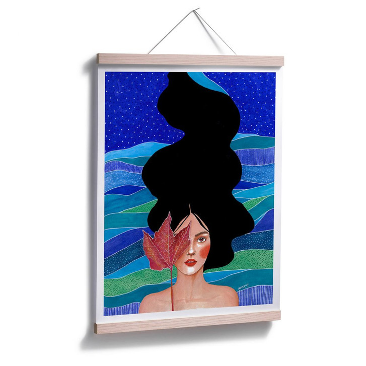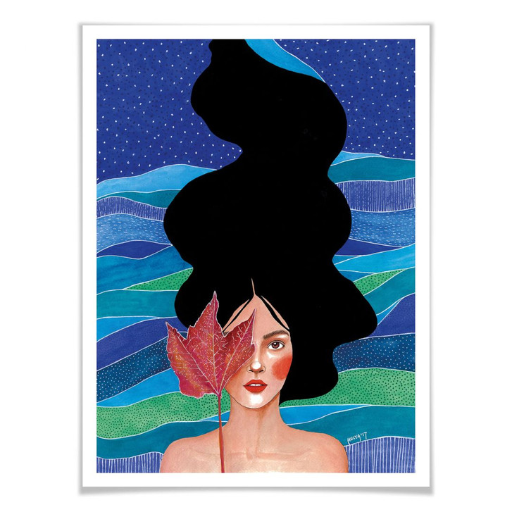 Es ist Herbst und langsam fallen die Blätter in Gelb-, Orange- und Rottönen ab und verteilen sich überall auf der Strasse. Die Frau mit langen schwarzen Haaren hält ein rotes Ahornblatt und symbolisiert das Typische an Herbst. Die Künstlerin Hülya Özdemir malt Frauen mit unterschiedlichen Hintergründen und Posen, aber stets in fröhlichen und auffallenden Farben, die gut miteinander harmonieren. Ihre Werke setzen farbliche Akzente und gestalten die Räumlichkeiten stilvoll und ästhetisch.