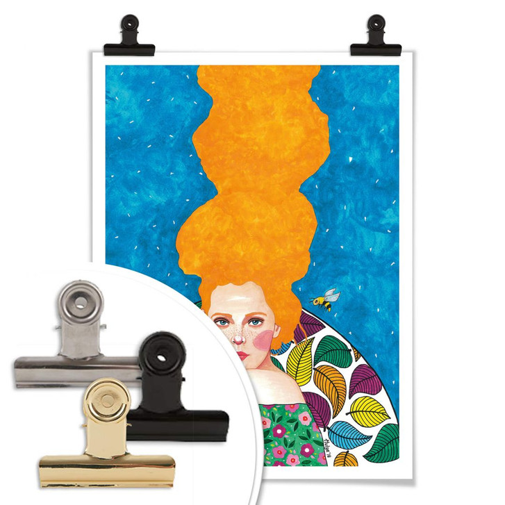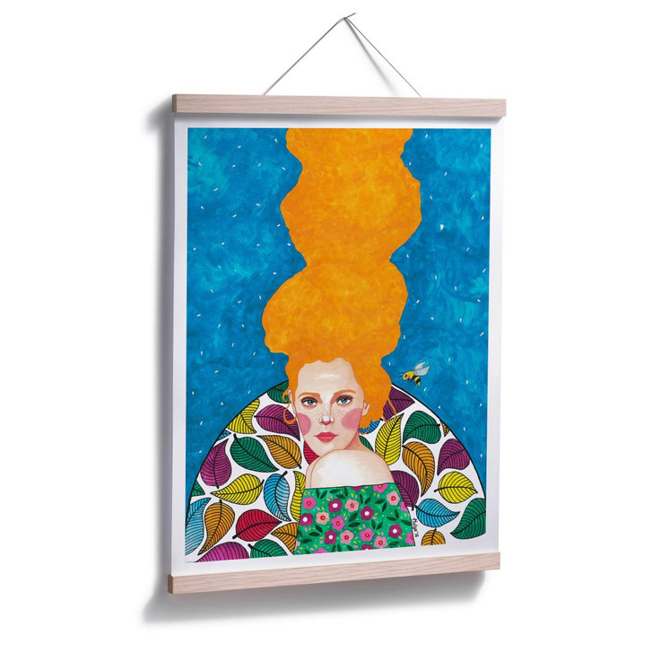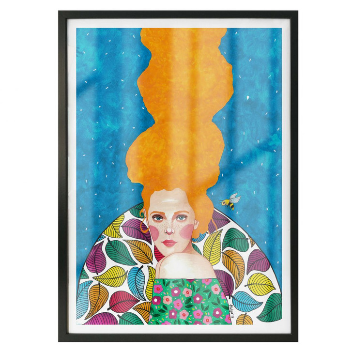 Diese Frau mit den orangenen Haaren trägt eine bunte Blumenbluse, die eine kleine Biene anzieht. Die Künstlerin Hülya Özdemir malt Frauenporträts in verschiedenen Farben und Posen, aber stets bunt und kreativ. Mit den Kunstwerken von Hülya setzen Sie defitiniv ein farbliches Highlight an Ihrer Wand und lassen die Räumlichkeiten lebendig wirken.