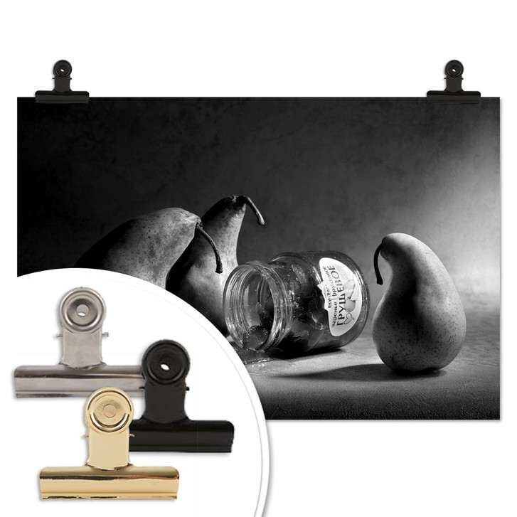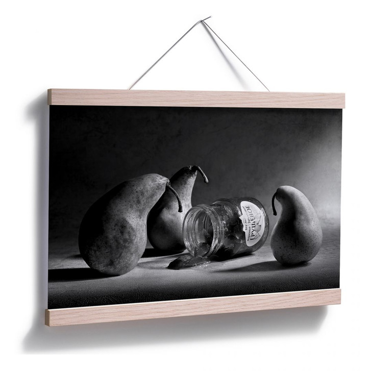 Das witzige Fotobild zeigt Birnen um ein Marmeladenglas versammelt, die gemeinsam an das zu Marmelade verarbeitete Birnen-Mitglied gedenken...Ein ironisches und einzigartiges Motiv für die Küche oder ähnliche Funktionsräume!