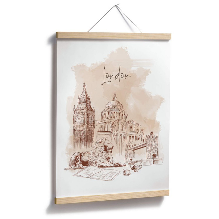 Zuhause ist der Ort, an dem man sich am besten entspannen kann. Umso wichtiger ist eine schöne Umgebung, die zum Wohlfühlen einlädt. Der Künstler zeigt die Wahrzeichen der Stadt London: Big Ben, Tower Bridge, St.-Pauls-Kathedrale, den Löwen auf dem Trafalgar Square sowie Teekanne und -tasse.