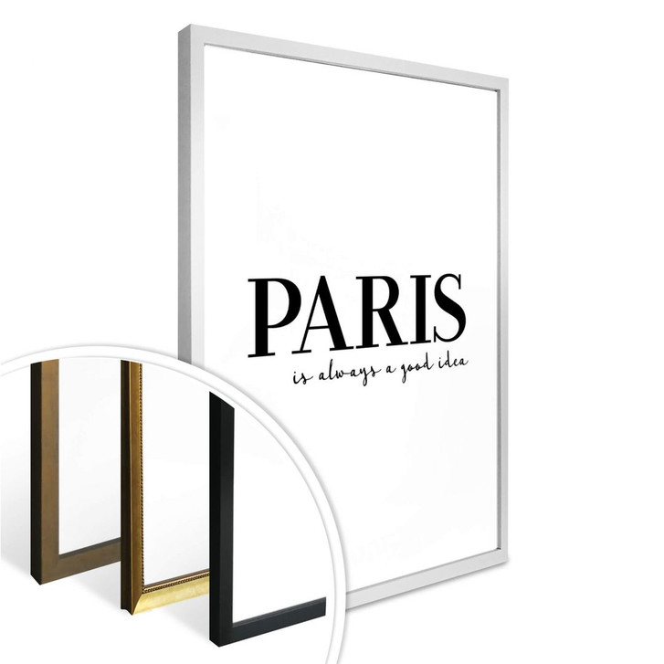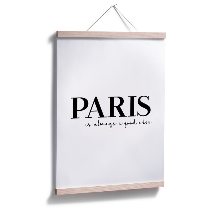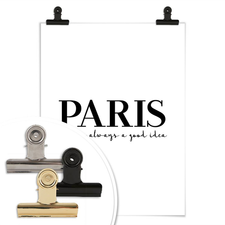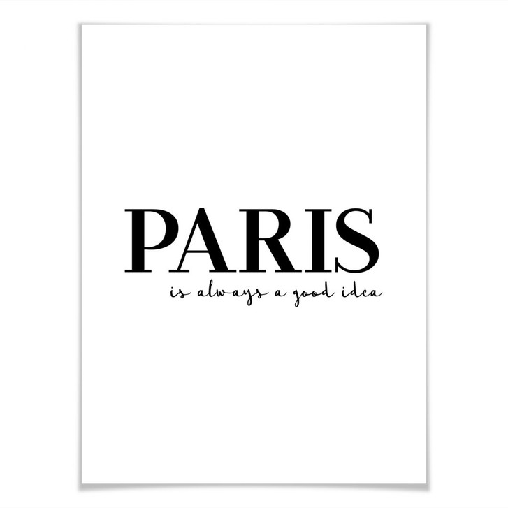 Das weisse Poster mit der schwarzen Schrift "Paris is always a good idea" ist ein Hingucker an der Wand. Das Poster mit dem Spruch "Paris ist immer eine gute Idee" ist in verschiedenen Grössen erhältlich. Die kreative Wandbefestigung können Sie bei uns gleich mitbestellen!
