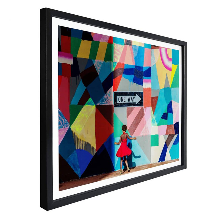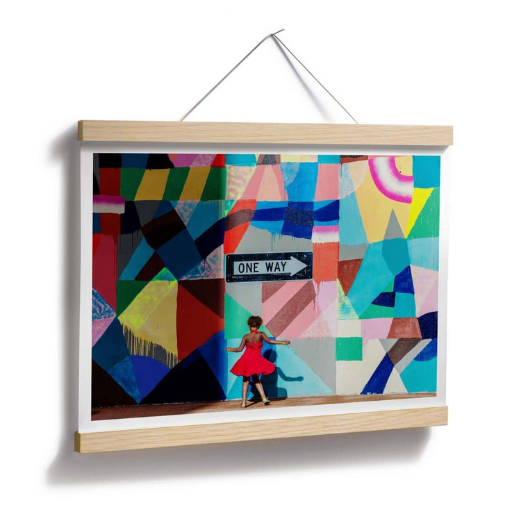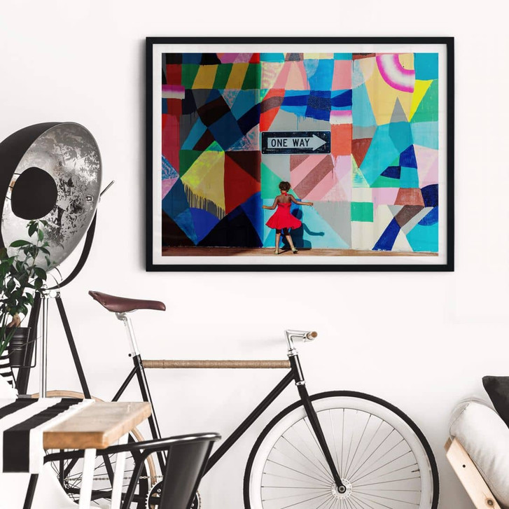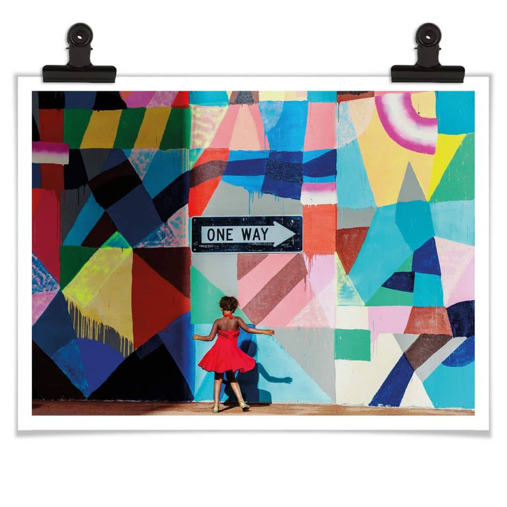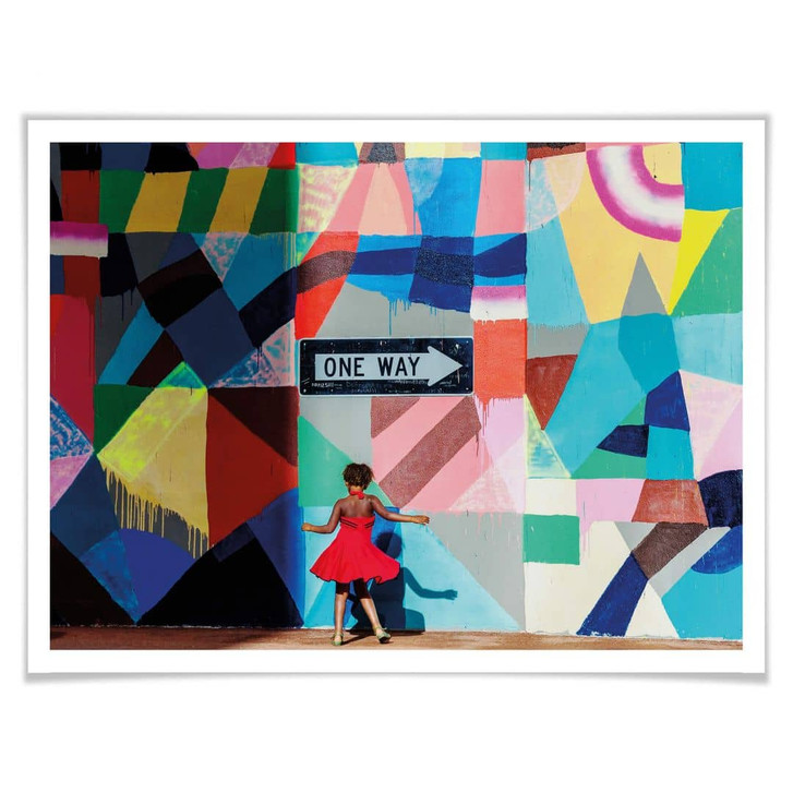 Entdecken Sie angesagte Trends und gestalten Sie Ihren Raum mit unseren Wandbildern! Das Poster mit der Fotokunst von Gloria Salgado Gispert ist ein bunter Eyecatcher an der Wand! Die Fotografie zeigt eine Tänzerin im roten Kleid, die sich vor einer bunt bemalten Wand bewegt. Dieses Wandgemäle in Perth wurde von der amerikanischen Künstlerin Maya Hayuk gestaltet. Diese ist für die grossen geometrischen Muster bekannt.