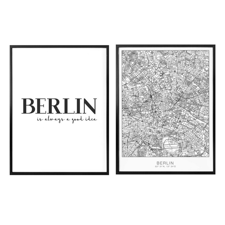 Schmücken Sie Ihre Wand mit diesem ausgefallenen Poster-Set! Das Set besteht aus den Postern "Berlin" und "Stadtplan Berlin". Beide Poster haben jeweils eine Grösse von 50x60cm. Im Lieferumfang sind zwei schwarze Bilderrahmen in den jeweils passenden Grössen enthalten.