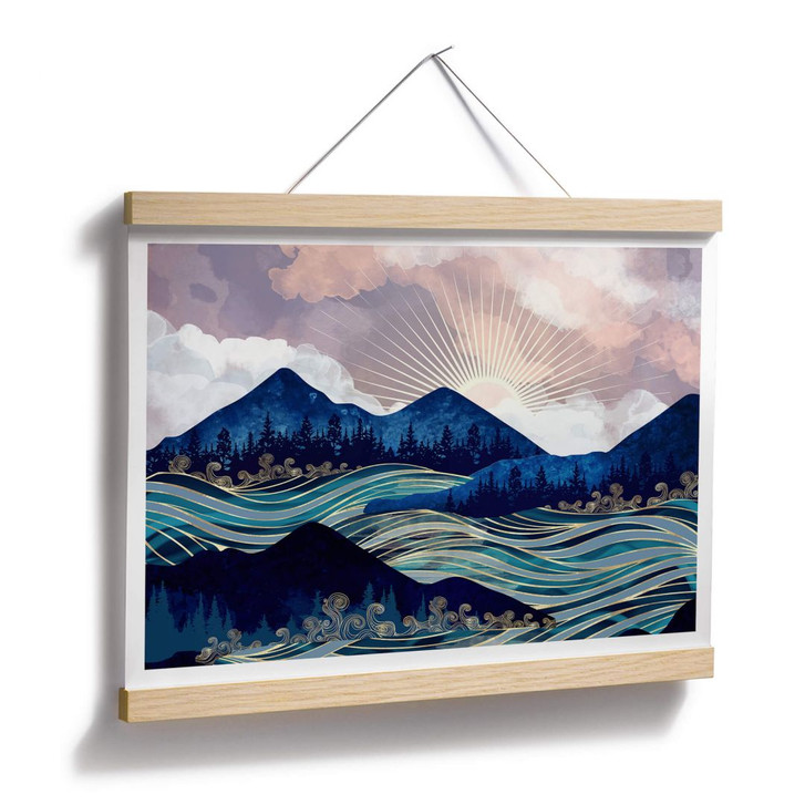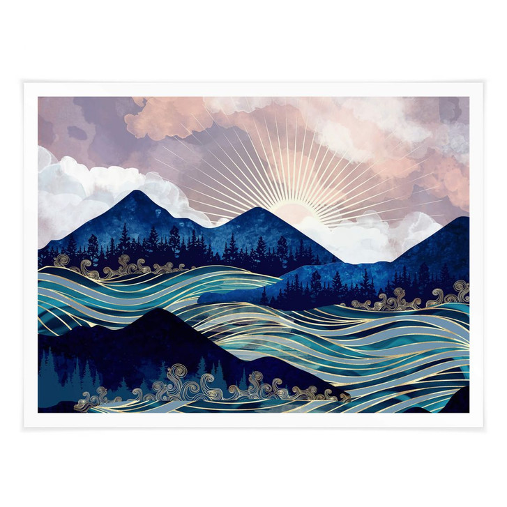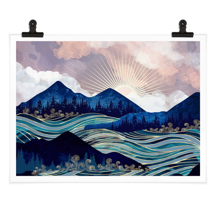 Sie haben Ihren ganz bestimmten Stil? Mit unserem Wandaccessoire setzen Sie ihn harmonisch in Szene. Verleihen Sie Ihrem Wohnbereich eine unverwechselbare Atmosphäre. Der Kunstdruck von SpaceFrog Designs zeigt eine beeindruckende Berglandschaft mit Bäumen. Der aufgewühlte Fluss mit den Wellen steht im Mittelpunkt und schlängelt sich durch das Gebirge.