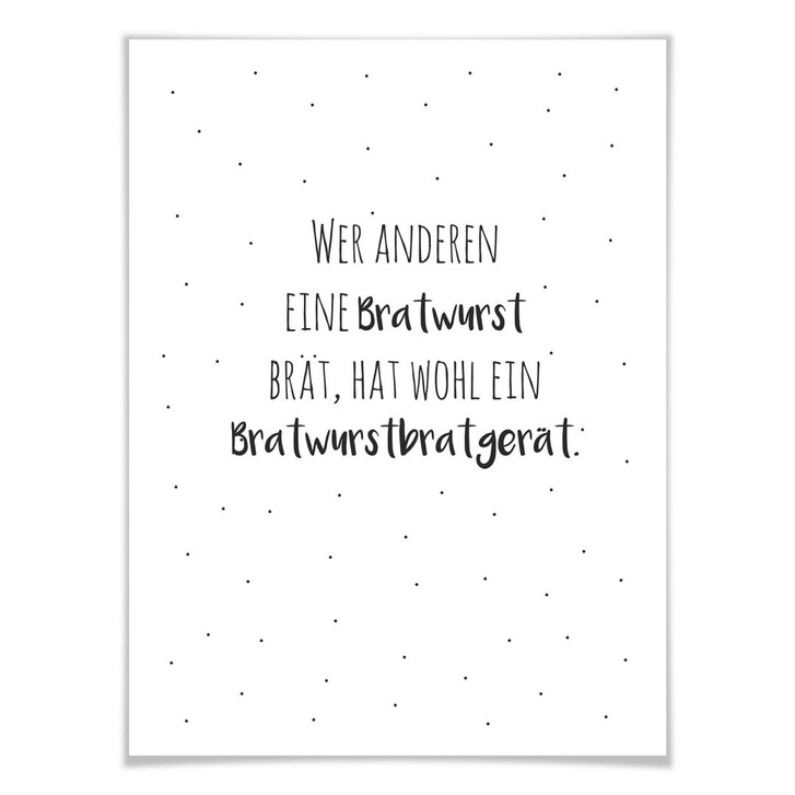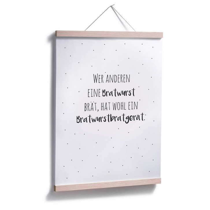 Versuchen Sie den Zungenbrecher mehrmals schnell hintereinander aufzusagen: "Wer anderen eine Bratwurst brät, hat wohl ein Bratwurstbratgerät." Das Poster ist in verschiedenen Grössen verfügbar. Auf Wunsch können Sie passende Washi Tapes, Bilderrahmen oder Posterleisten zur Befestigung mitbestellen.
