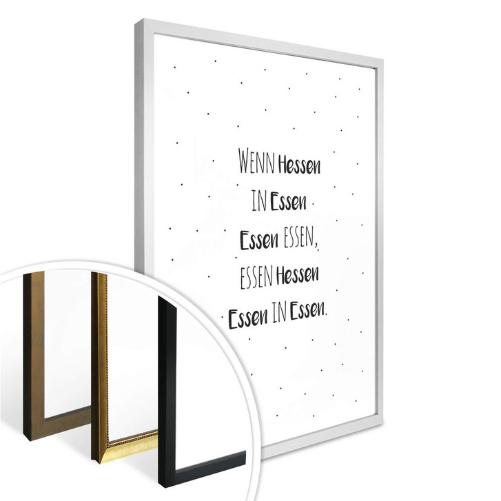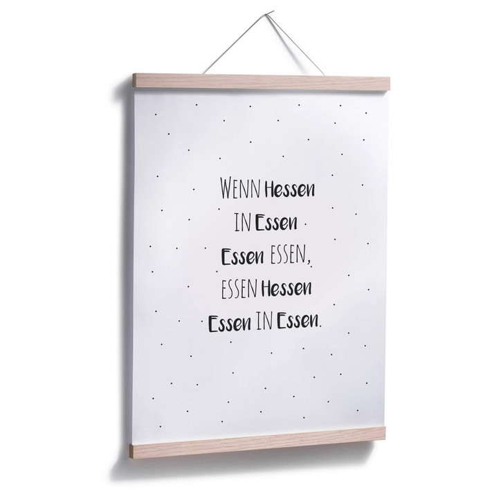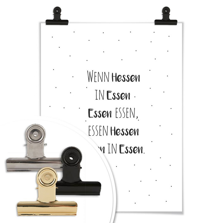 Versuchen Sie den Zungenbrecher mehrmals schnell hintereinander aufzusagen: "Wenn Hessen in Essen Essen essen, essen Hessen Essen in Essen." Das Poster ist in verschiedenen Grössen verfügbar. Auf Wunsch können Sie passende Washi Tapes, Bilderrahmen oder Posterleisten zur Befestigung mitbestellen.