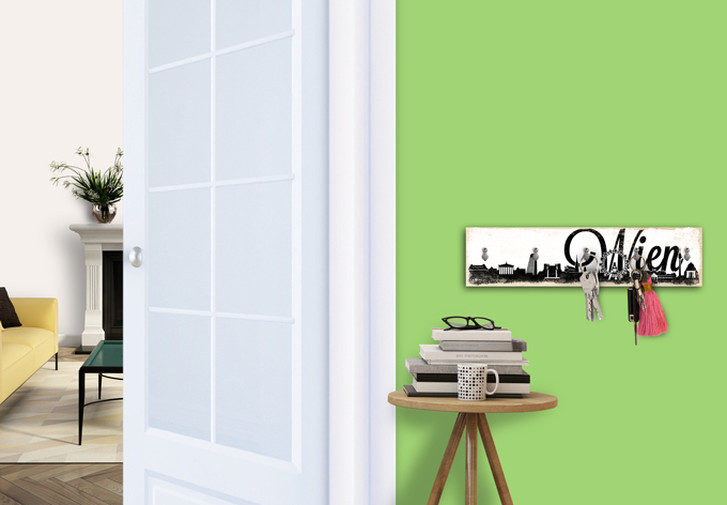 Holzschild mit dem Schriftzug "Wien". Für eine schnelle Wandmontage sind zwei angebrachte Zackenaufhänger inklusive. Die fünf Haken aus Edelstahl liegen dem Produkt bei. Für eine leichtere Anbringung haben wir die Löcher für Sie vorgebohrt.
