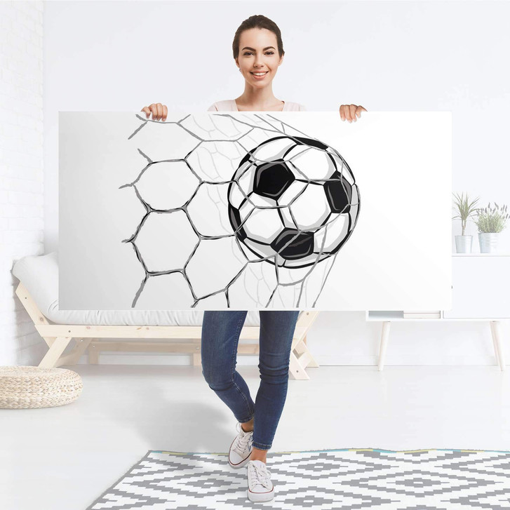Das Trägerpapier von der Folie ca. 10-20 cm abziehen und am oberen Bereich des Objektes positionieren. Zieh jetzt das Trägerpapier Stück für Stück von der Motivfolie nach unten hin ab und streiche das Motiv vorsichtig an der Möbeloberfläche fest.