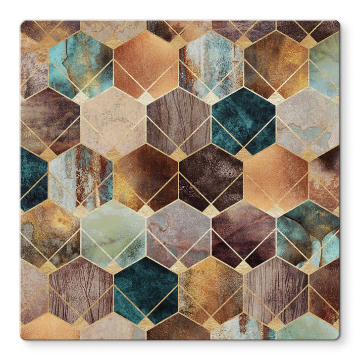 Stilvolle Tische dürfen in der Wohnung nicht fehlen, um den Räumen Gemütlichkeit zu verleihen. Kleine Couch-, Ess- und Gartentische sind oftmals der erste Blickfang beim Betreten des Raumes. Daher verdienen sie mehr Beachtung in puncto Design. Diese hochwertige Platte mit dem Kunstdruck von Elisabeth Fredrikkson besteht aus 6mm starkem Sicherheitsglas, das mit seinem kratzfesten und robusten Material überzeugt. Mit diesem quadratischen Accessoire kann der Tisch aufgepeppt werden. Die Hexagone sind mit Edelsteinfarben von gold über türkis bis braun kreiert worden. In Verbindung mit den goldfarbenen Linien mit Glitzereffekt entsteht eine georndete Struktur und ruft einen glamourösen Look hervor. Die Oberfläche kann mit einem handelsüblichen Glasreiniger gesäubert werden.