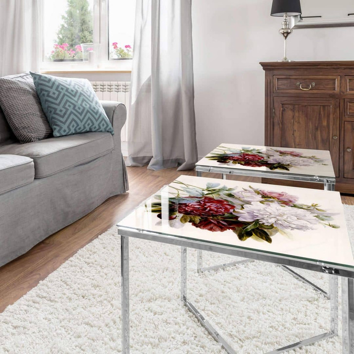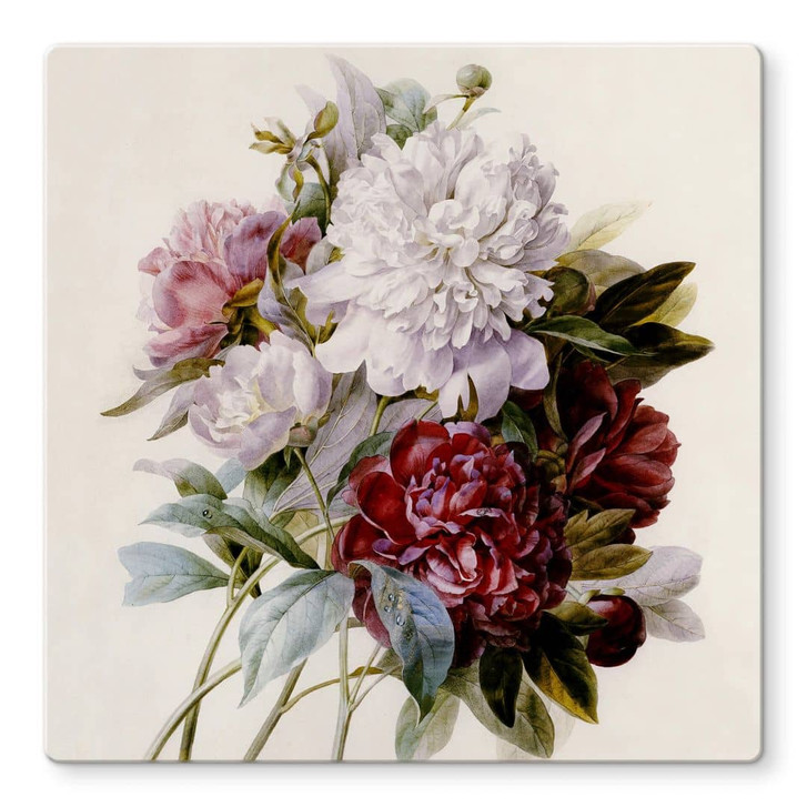 Diese quadratische Tischplatte aus 6mm starkem Glas eignet sich ideal für Ess- und Couchtische und ist ein wahrer Hingucker! Runden Sie Ihren Wohnstil mit der hochwertigen Tischplatte und kreieren Sie sich eine harmonische Umgebung zum Wohlfühlen. Setzen Sie mit diesem berühmten Meistwerk von Pierre-Joseph Redouté ein blumiges Hightlight im Zimmer. Die roten, lila und weissen Pfingstrosen sind zu einem schönen Strauss zusammen gebunden. Die Platte kann auch auf die vorhandene Tischfläche platziert werden, um dem Tisch einen neuen Look zu verleihen. Die Oberfläche kann mit einem handelsüblichen Glasreiniger gesäubert werden.
