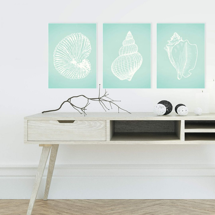Das dreiteilige Hartschaum-Wandbild zeigt verschiedene Muschel-Motive aus harmonisch illustrierten Perspektiven in den wunderschönen Farben des Meeres - ein toller Hingucker an jeder Wand!