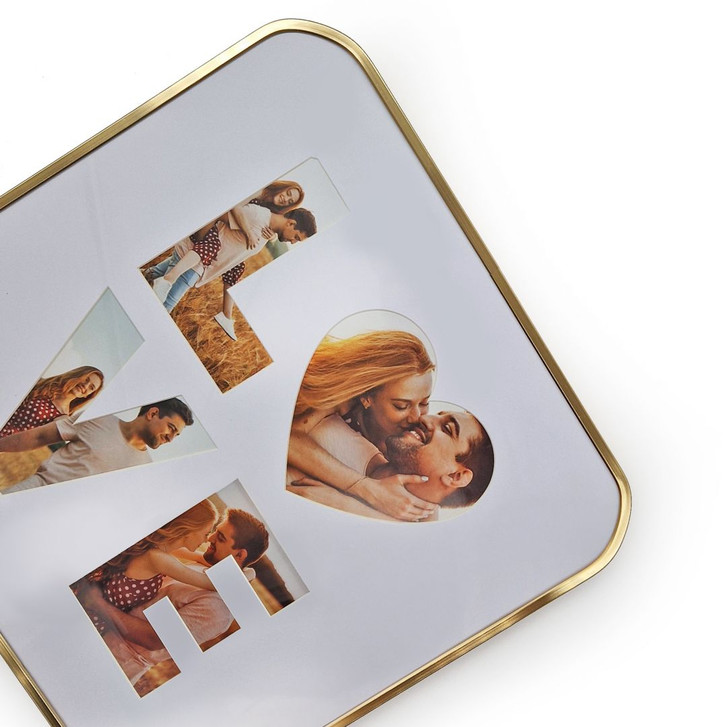 Gib deinen schönsten Liebesmomenten den perfekten Rahmen mit diesem einzigartigen „LOVE“-Bilderrahmen. Mit seinem modernen Design und der eleganten Goldkante setzt dieser Rahmen deine Fotos auf besondere Weise in Szene. Die Buchstaben „L“, „V“, „E“ und das Herzsymbol bieten Platz für deine schönsten Erinnerungen und setzen sie eindrucksvoll in Szene. Der einzigartige herzförmige Ausschnitt unterstreicht den romantischen Charakter des Rahmens und macht ihn zu einem Highlight in jedem Raum.