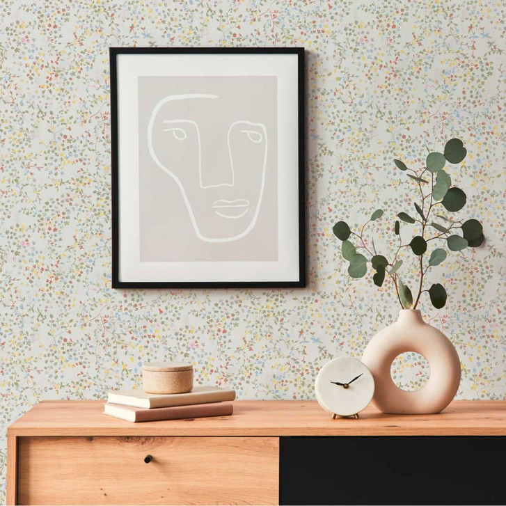 Pintwalls II - Zarte Vliestapete mit verspielten Blumenranken in Gelb, Grün und Blau für eine frische und natürliche Wandgestaltung.