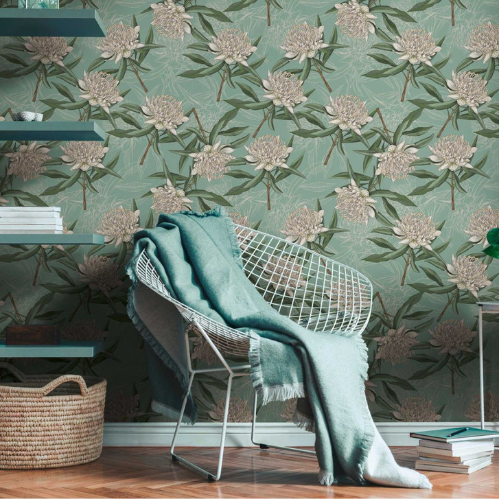 Florale Vliestapete Hellgrün - Blumen-Tapete mit weissen Blüten